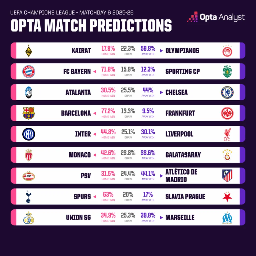 Barcelona là lựa chọn tự tin nhất trong tuần này, với tỷ lệ thắng áp đảo 77,2% trước Eintracht Frankfurt (9,5%). Robert Lewandowski, với 15 bàn trong 15 lần đá chính gần nhất trước Frankfurt, chính là lời nguyền cá nhân cho đội bóng Đức. Sau khi bị Atlético Madrid đè bẹp 5-1 trên đất Tây Ban Nha, Frankfurt đang đứng trước nguy cơ tịt ngòi 3 trận cúp châu Âu liên tiếp lần đầu tiên kể từ năm 1990.