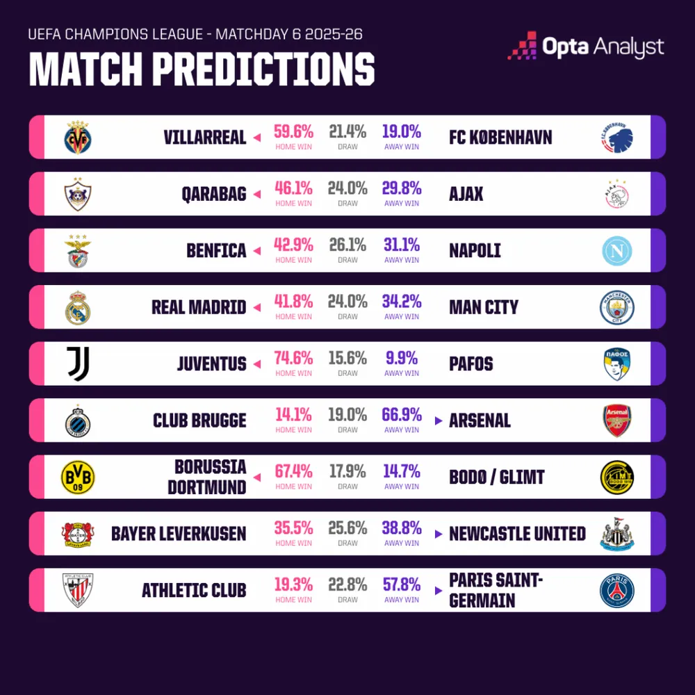 Đội bóng duy nhất giữ thành tích 100% thắng, Arsenal (66,9% thắng), hành quân đến Bỉ đối đầu Club Brugge (14,1%). Brugge đã ghi hơn 3 bàn/trận trong cả hai trận sân nhà UCL mùa này, nhưng họ đối đầu với một hàng thủ Arsenal đã thắng 9 trận vòng bảng liên tiếp, ghi 27 bàn và chỉ thủng lưới 3. Giải pháp cho Arsenal là sự tập trung tuyệt đối để phá vỡ giới hạn lịch sử của Liverpool (12 trận thắng liên tiếp).