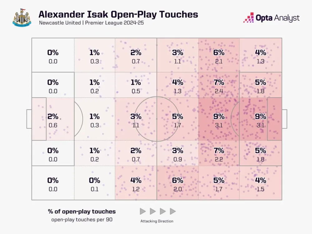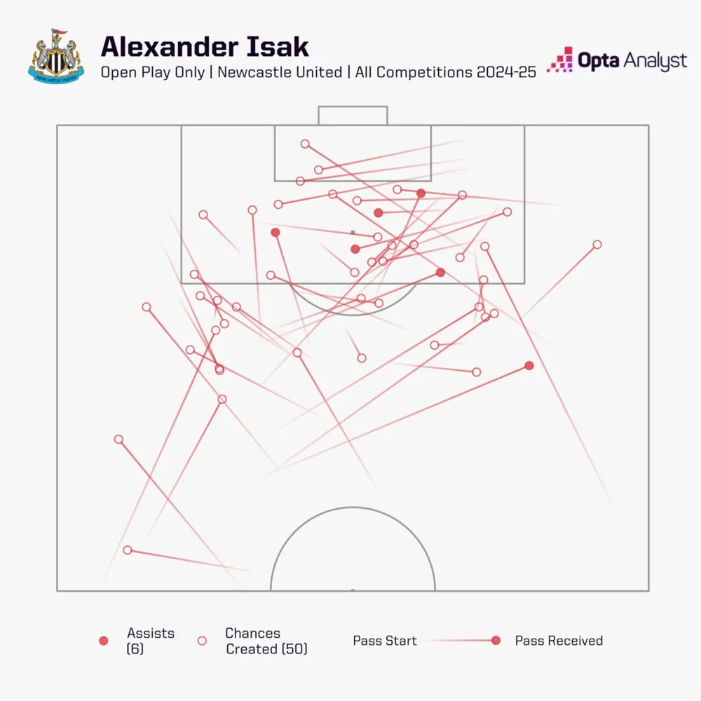 Isak cũng tham gia vào trận đấu nhiều hơn so với nhiều trung phong khác tại Premier League. Anh trung bình 36,8 lần chạm bóng mỗi 90 phút trong mùa giải 2024-25. Con số này cao hơn người mà anh thay thế tại Anfield, Darwin Núñez (33,2), cũng như Nicolas Jackson (30,9), Jean-Philippe Mateta (28,3), Ollie Watkins (27,0), Chris Wood (25,0), Evanilson (24,3) và, không ngạc nhiên, Haaland (22,9).