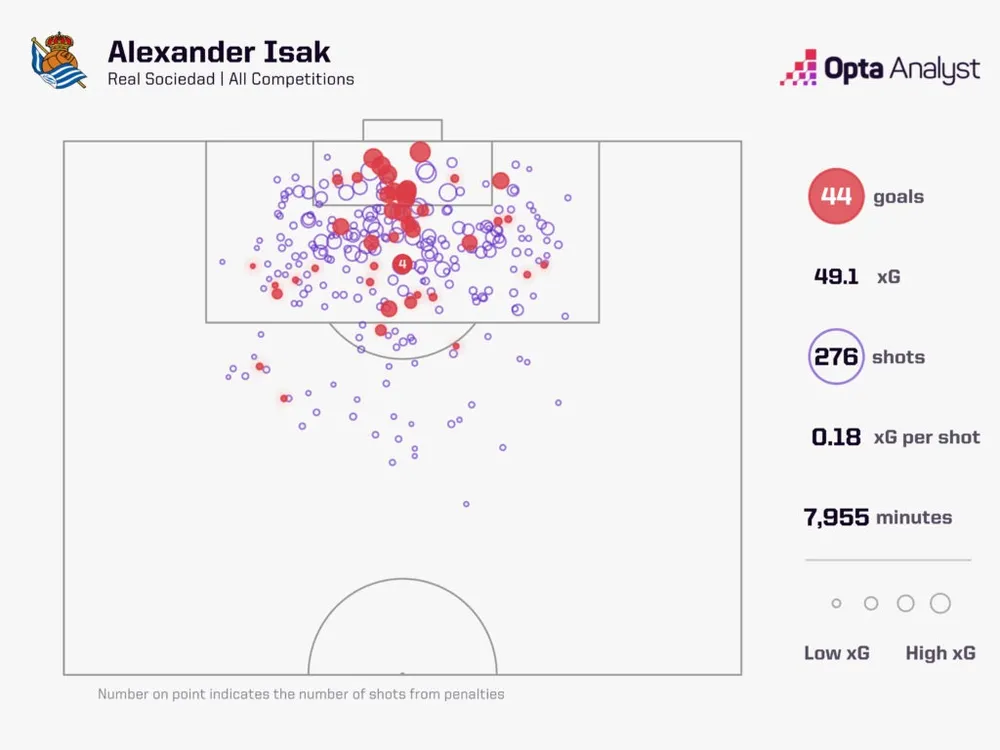 Không ngạc nhiên khi Isak là một trong những người dứt điểm sắc bén nhất tại Premier League trong mùa giải 2024-25. Tỷ lệ chuyển hóa cú sút không phải phạt đền của anh là 26,4% từ 95 cú sút; chỉ có bốn cầu thủ (tối thiểu 50 cú sút) có tỷ lệ cao hơn, hai trong số đó là tân binh tiềm năng của Newcastle, Yoane Wissa (27,5%) và mục tiêu thay thế được đồn đoán Jørgen Strand Larsen (28,6%). Tỷ lệ chuyển hóa của Isak cao hơn cả Haaland (21,6%) và Salah (21,1%).