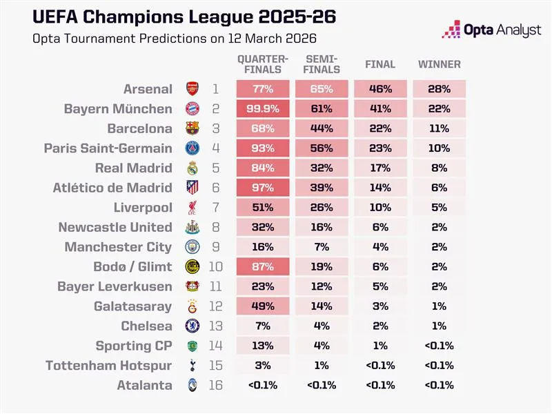 Nhưng trên thực tế, cơ hội để Tottenham, Man City, Chelsea và Sporting (hay Atalanta) lọt vào tứ kết là bao nhiêu? Máy tính Opta đưa ra các con số: