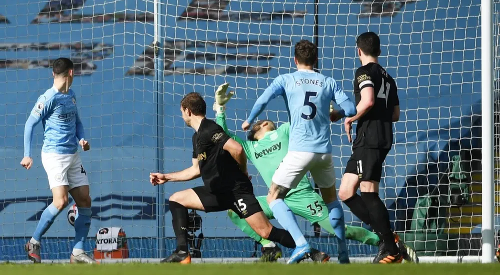 Phút 30, sau một pha phạt góc, West Ham phá bóng lên nhưng lại lọt vào chân đ0ối thủ, bóng lập tức được chuyền sang cánh phải cho Kevin De Bruyne và ngôi sao người Bỉ đã ngoặt bóng lại để thực hiện đường chuyền bằng chân trái, rót bóng vào sâu trong khu cấm khi cặp trung vệ Man Xanh lên tham gia tấn công (chưa về kịp). Và Ruben Dias đã không bỏ qua cơ hội đành đầu ghi bàn cận thành, đó cũng là pha dứt điểm đúng hướng đầu tiên của họ so với 4 quả trước đó của đội khách.