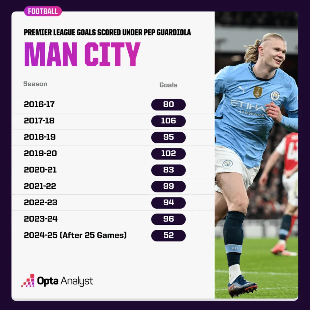 Dù vậy, họ đã thắng năm trong bảy trận gần nhất tại giải đấu (thua 1), ghi 22 bàn trong thời gian đó để cải thiện phần nào các con số của mình. Bất chấp điều đó, City đang trên đà ghi 79 bàn tại giải đấu mùa này, con số thấp nhất của họ tại Premier League kể từ khi Guardiola đến, với 80 bàn trong mùa giải đầu tiên của ông tại Anh.