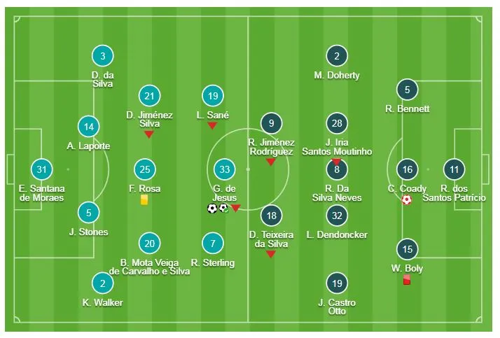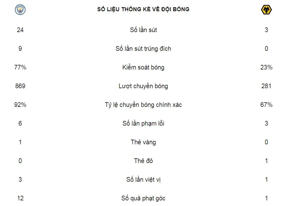 Trận đấu muộn nhất vòng 22 Premier League, Man City dễ dàng thắng Wolverhampton với tỷ số 3-0. Tiền đạo Gabriel Jesus tiếp tục tỏa sáng bằng cú đúp bàn thắng và Coady bất ngờ phản lưới nhà ấn định thua 0-3 trước đoàn quân HLV Pep Guardiola. Thắng trận này, Man City tiếp tục duy trì khoảng cách 4 điểm với đội đầu bảng Liverpool.