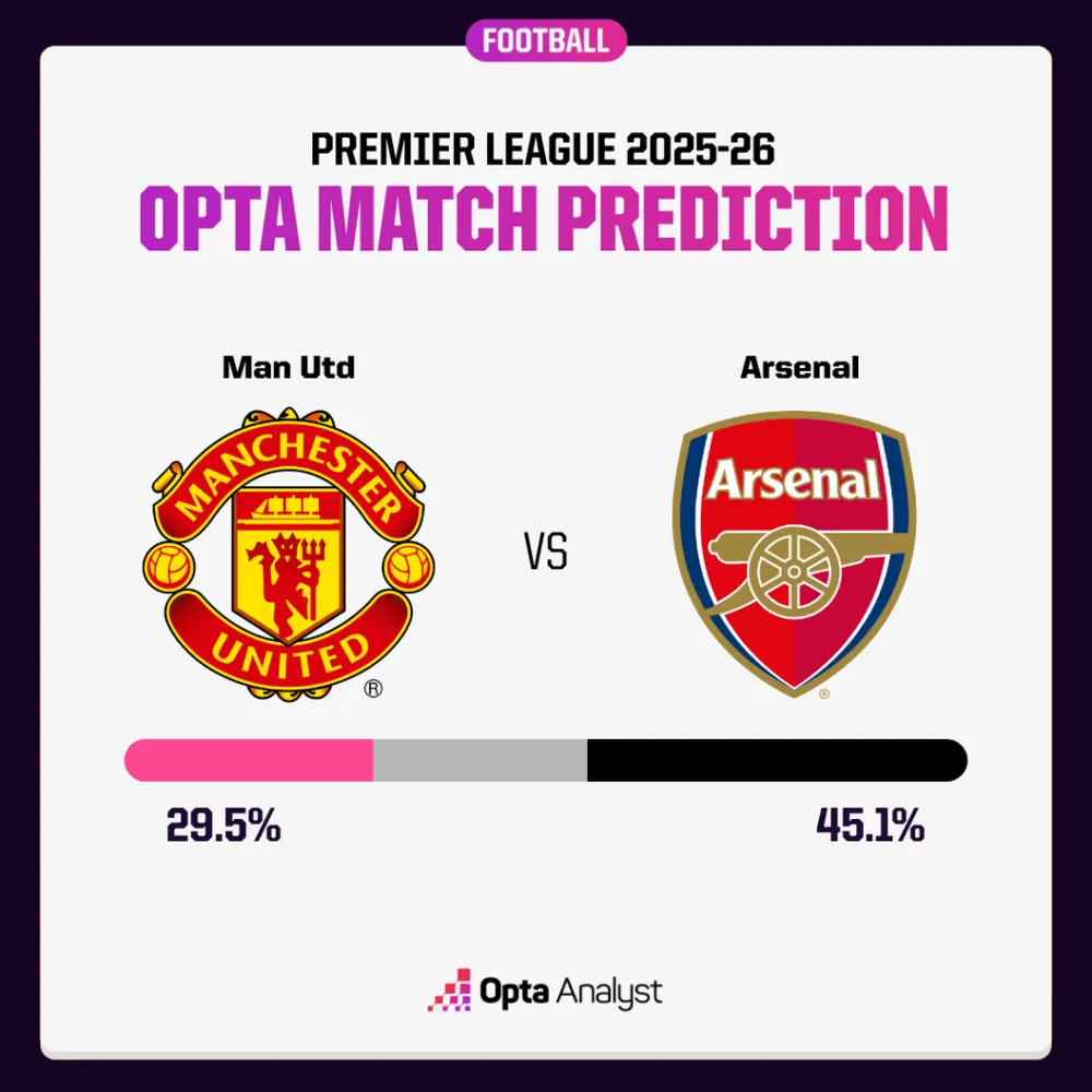 Thống kê ủng hộ Arsenal. Theo siêu máy tính Opta, Pháo Thủ có 45,1% cơ hội thắng tại Old Trafford, so với 29,5% của Man United. Arsenal bất bại trong 14 trận sân khách gần nhất tại Premier League (thắng 7, hòa 7), và họ ghi bàn trong cả 11 lần gần nhất đến Old Trafford.