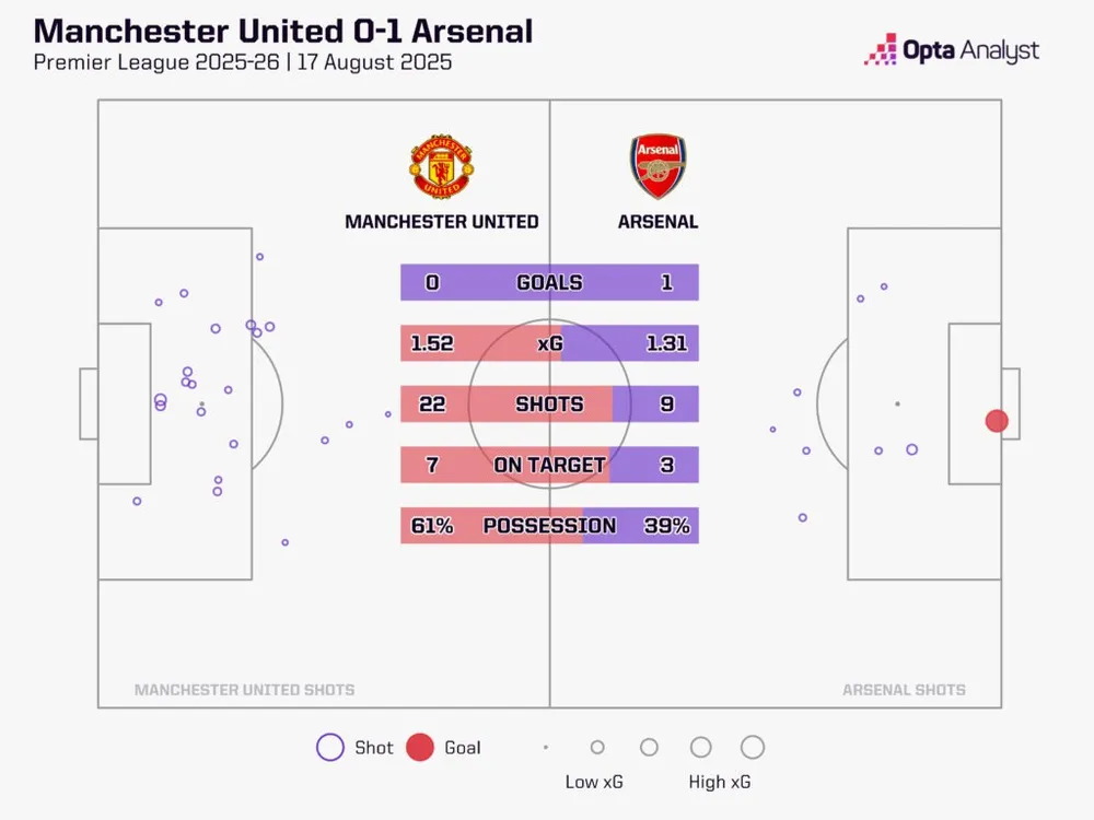 Ngay ở trận đấu đầu mùa tại Old Trafford, Man United đã cho thấy họ có thể tạo ra cơ hội trước Arsenal (1.52 xG - cao thứ 3 mà Arsenal để lọt lưới mùa này). Nhưng với chỉ một sai lầm từ pha đá phạt, Man United đã không thể tìm ra lời giải cho bức tường phòng ngự đặc biệt kiên cố của đối thủ. Arteta thậm chí thừa nhận đội của ông "không hài lòng" với màn trình diễn đó, cho thấy họ không hề chơi tiêu cực.