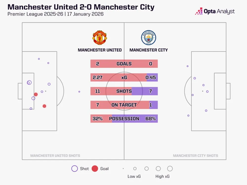 Tỷ số 2-0 chưa phản ánh hết sự thống trị. Man United còn có 3 bàn không công nhận vì việt vị mong manh, 2 lần đánh trúng khung thành, và buộc thủ môn Donnarumma của City phải cản phá 5 lần – con số cao nhất của anh ở Man City. Chênh lệch các xG (chỉ số phản ánh chất lượng cơ hội) lên tới 1.82 nghiêng về Man United, một trong những mức chênh lệch lớn nhất mà Man City phải hứng chịu dưới thời Guardiola tại Ngoại hạng Anh.