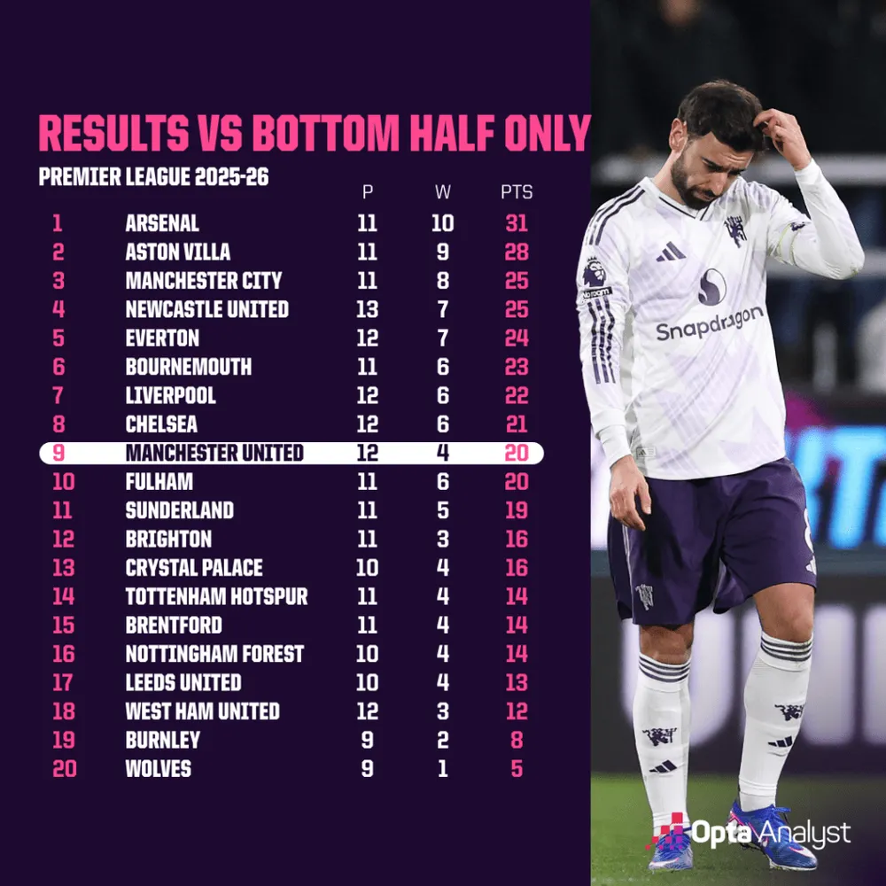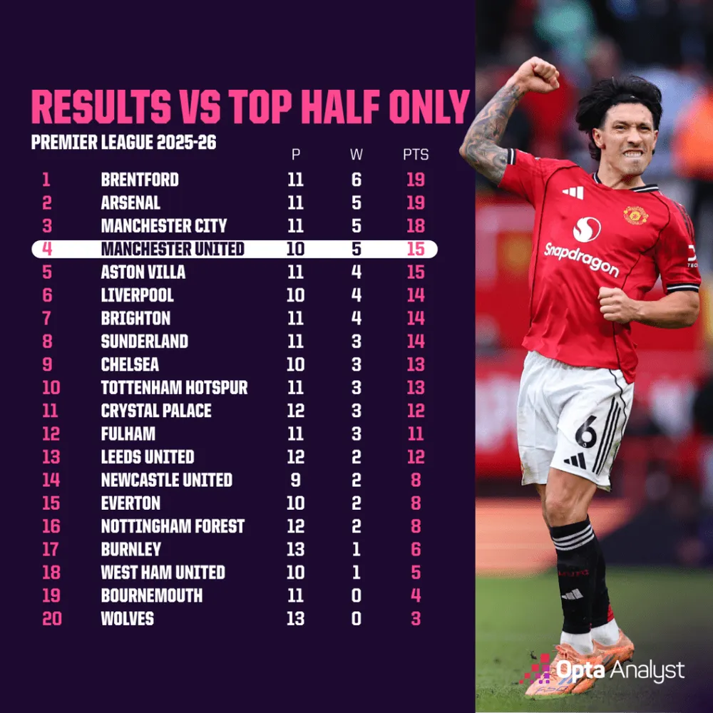 Nghịch lý đáng lo ngại: Thống kê cho thấy Man United dưới thời Amorim có thành tích trung bình tệ hơn trước các đội bóng nửa dưới bảng xếp hạng (1.40 điểm/trận) so với các đội mạnh ở nửa trên (1.11 điểm/trận). Điều này củng cố cho nhận định rằng Man United gặp khó khăn trong việc "phá vỡ" thế trận khi phải đối mặt với những đội bóng chơi phòng ngự chặt, nhường thế chủ động. Mùa giải năm nay, điều nghịch lý vẫn tiếp diễn: Man United đã thắng nhiều trận hơn trước các đội top đầu (5) so với các đội nửa dưới (4).