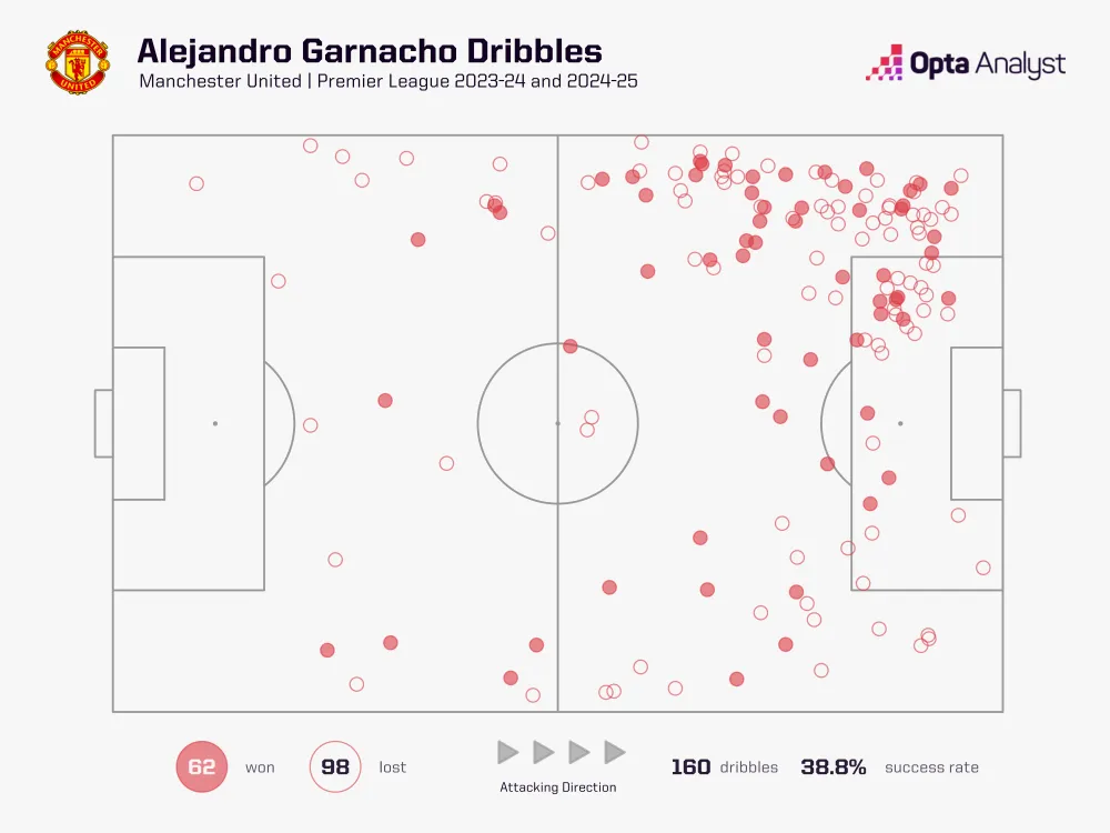 Câu hỏi khác cần được đặt ra là: liệu Man United có nên cố gắng thuyết phục Garnacho hay không? Cựu đội trưởng United Paul Scholes gần đây đã gọi Garnacho là "lộn xộn" về mặt kỹ thuật, và đó là một đánh giá dễ hiểu khi nói đến khả năng của anh ấy trong không gian hẹp. Ví dụ, trong số 151 cầu thủ đã thực hiện ít nhất 50 lần rê bóng ở Premier League kể từ đầu mùa giải trước, Garnacho xếp thứ 125 về tỷ lệ rê bóng thành công (38,8%).