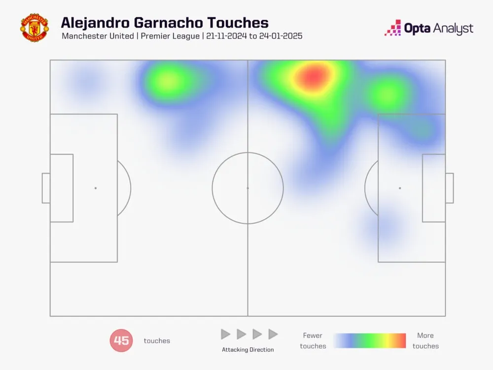 Bây giờ, nhìn vào khu vực chạm bóng của Garnacho trong mọi giải đấu kể từ khi Amorim đến