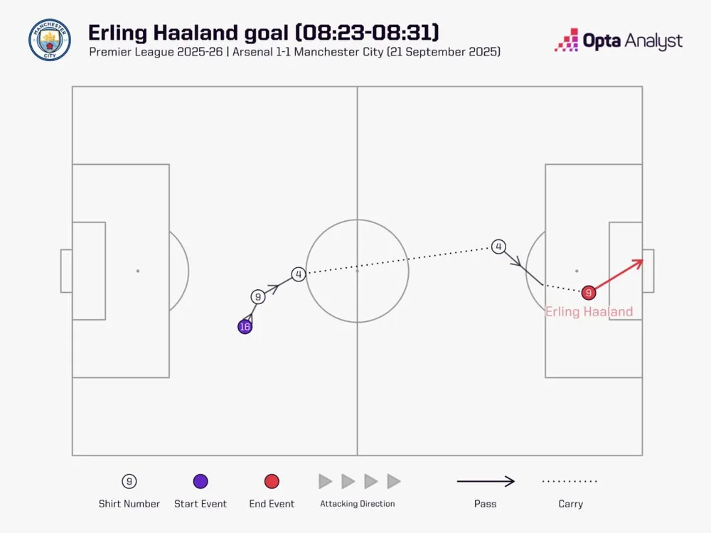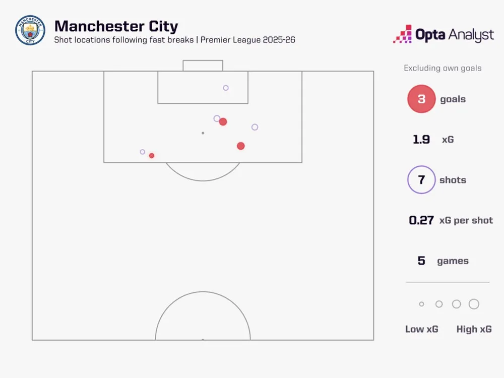 Đó là bàn thắng thứ ba của Man City từ các tình huống phản công nhanh tại Ngoại hạng Anh mùa này, giúp họ trở thành đội ghi nhiều bàn loại này nhất. Chỉ có Man United (8) có nhiều cú dứt điểm từ phản công hơn Man City (7). Quan trọng hơn, chất lượng các cơ hội từ pha phản công của Man City là rất cao, với chỉ số xG trung bình mỗi cú sút là 0.27, so với mức trung bình toàn mùa là 0.17 xG/cú sút. Ngược lại, Man United dù có nhiều cú sút hơn nhưng vẫn chưa ghi được bàn nào từ phản công.