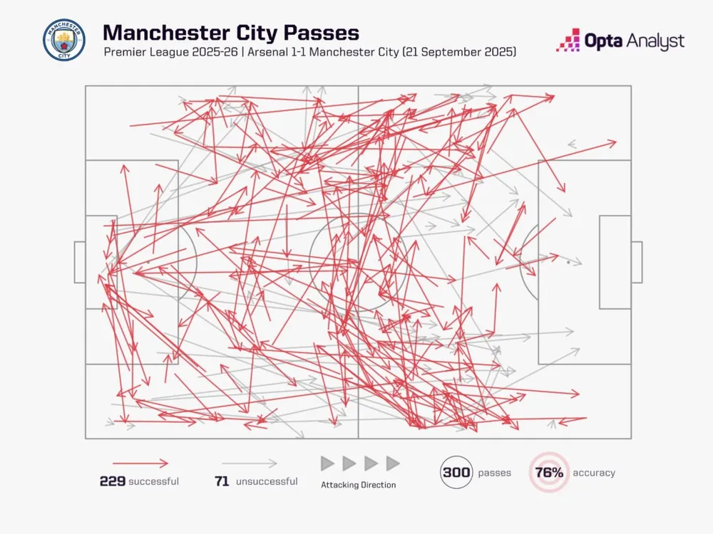 Trận đấu với Arsenal diễn ra chỉ một tuần sau khi Man City có 45.3% kiểm soát bóng trong chiến thắng 3-0 trước Man United. Như vậy, họ đã có ít hơn 50% kiểm soát bóng trong 2 trận mùa này, bằng tổng số lần nhiều nhất ở bất kỳ mùa giải nào trong 5 năm qua. Điểm khác biệt là, nếu như trước Man United họ dễ dàng kiểm soát thế trận thì trước Arsenal, Pep cố gắng bảo toàn tỷ số bằng cách lùi sâu phòng ngự. Ông thay các tiền đạo Foden và Haaland bằng hai hậu vệ Ake và Nico Gonzalez. Tuy nhiên, chiến thuật này đã thất bại khi Gabriel Martinelli gỡ hòa ở những phút cuối. Thật khó để tin rằng Pep, người luôn muốn đội nhà giữ bóng để bảo vệ thành quả, lại chấp nhận một kết cục như vậy.
