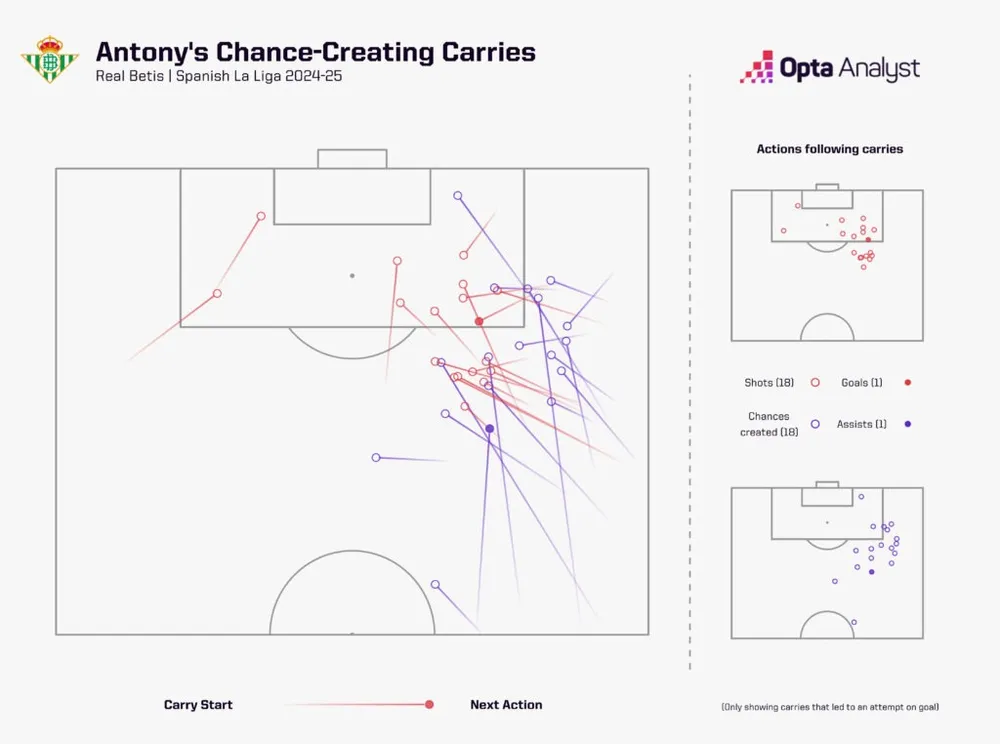 Dù có màn ăn mừng phô trương, Antony không diễn. Anh thực sự hạnh phúc, và điều đó thể hiện qua màn trình diễn của anh. Anh đạt trung bình 12,1 lần rê bóng tiến lên mỗi 90 phút tại La Liga mùa 2024-25, chỉ sau Lamine Yamal và Vinícius Júnior trong số các tiền đạo chơi từ 1.000 phút trở lên trong giải đấu này.