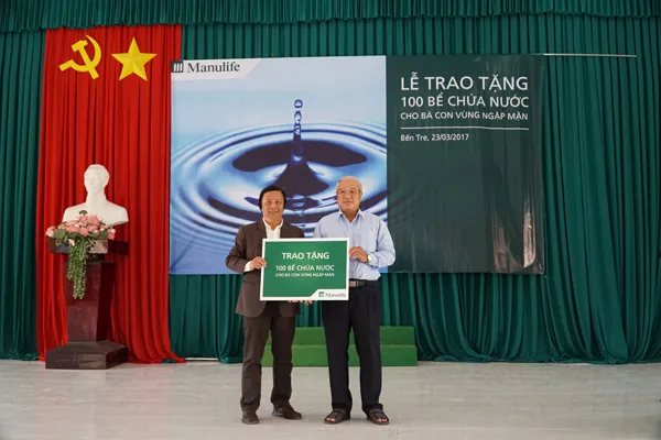 Manulife Việt Nam vừa trao 100 bể bê tông có sức chứa 2.000 lít nước/bể, trị giá 200 triệu đồng, tặng các gia đình khó khăn vùng ngập mặn tỉnh Bến Tre. Đây là hoạt động cấp thiết vì những năm gần đây, tình hình xâm nhập mặn nghiêm trọng ảnh hưởng xấu đến sản xuất, sinh hoạt của nhiều hộ dân Bến Tre.