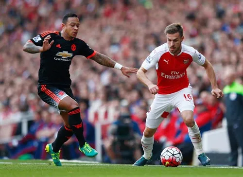 Memphis Depay (trái, Man.United) tranh bóng với Aaron Ramsey (Arsenal)