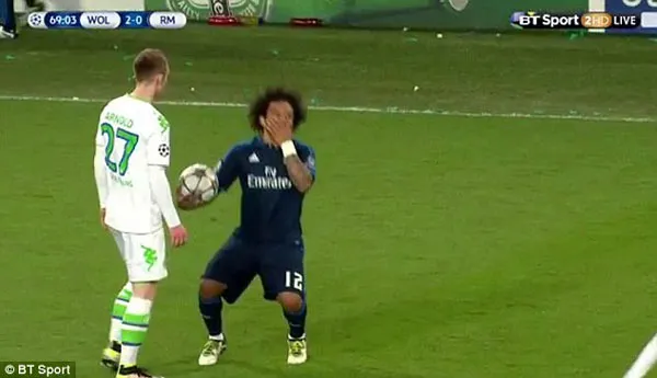 Tình huống xảy ra ở phút 69 khi Marcelo phạm lỗi với Maximilian Arnold. Người nâng tỷ số lên 2-0 cho Wolfsburg nổi nóng phản ứng lại hậu vệ trái của Real Madrid. Marcelo quay lại định thực hiện màn “thiết đầu công” nhưng anh nhanh chóng té bật ngửa ra như thể bị Arnold tung cú knock out. Trọng tài người Italia Gianluca Rocchi rút thẻ vàng với Arnold mà quên mất rằng Marcelo mới là người gây sự.