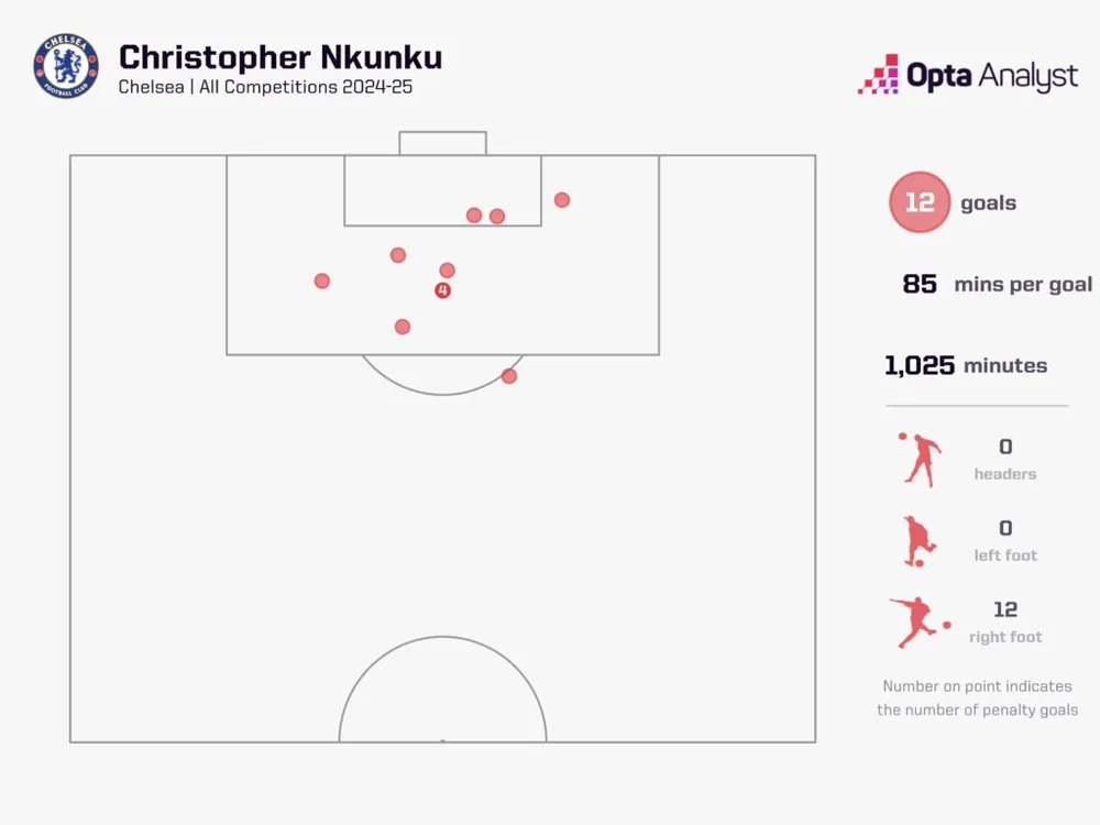 Christopher Nkunku ghi bàn tất cả các trận đấu 2024-25