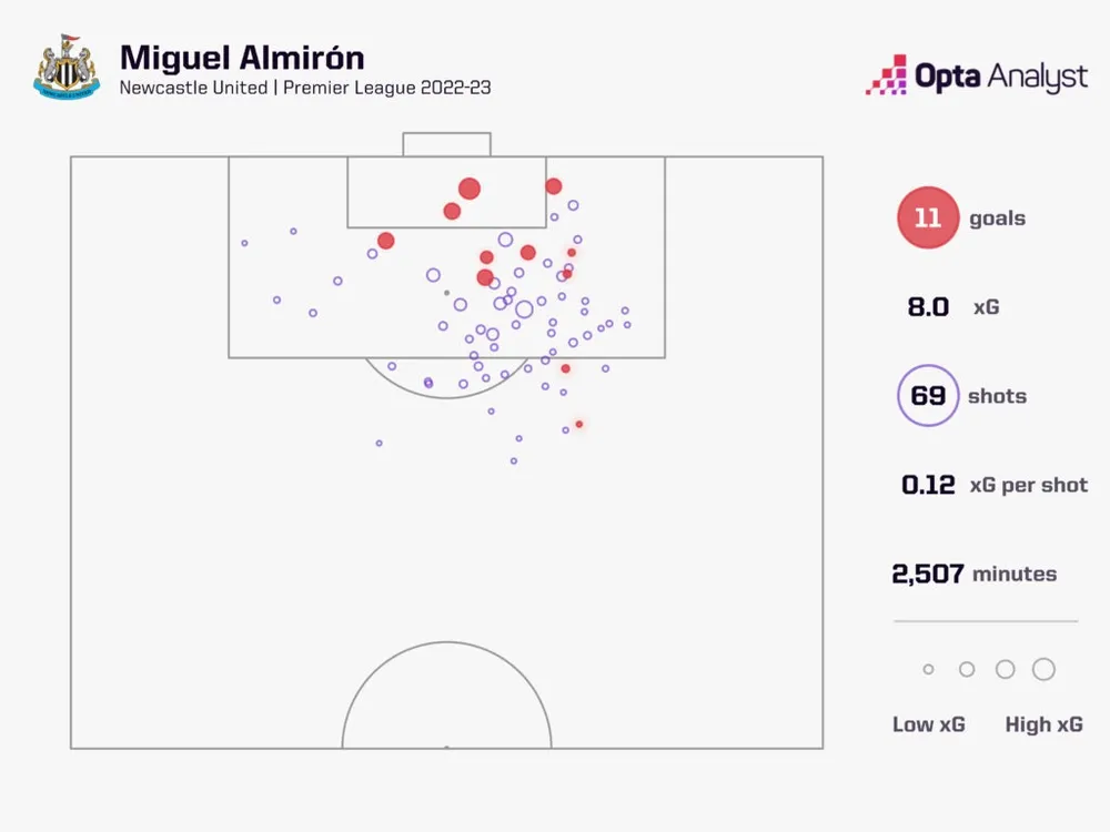 Đó là mùa giải 2022-23 khi cầu thủ chạy cánh này tìm thấy nhịp điệu của mình tại Tyneside. Almirón đã ghi được 10 bàn thắng trong 22 trận đầu tiên của anh tại Premier League mùa giải đó, nhiều hơn một bàn so với tổng số 110 lần ra sân trước đó của anh trong bốn mùa giải đầu tiên của anh tại giải đấu này cộng lại (chín bàn thắng). Anh kết thúc chiến dịch với 11 bàn thắng trong 34 lần ra sân, nhưng chỉ ghi được ba bàn trong 40 trận tại Premier League kể từ đó.