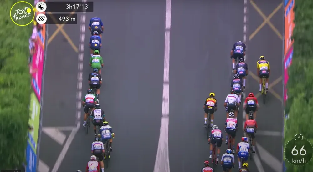 Cảnh tượng các tay đua “bố trận” nước rút thật ấn tượng. Các tay đua xếp thành hai hàng tách biệt để rút về đích. Phía bên phải, đội Alpecin-Fenix dốc toàn lực làm việc cho Jasper Philipsen, trong khi đó bên đối diện, Deceuninck-QuickStep cũng tràn quân lên để đưa Mark Cavendish về đích. Hai hàng VĐV như hai mũi tên lao về đích với tốc độ gần 70km/h.