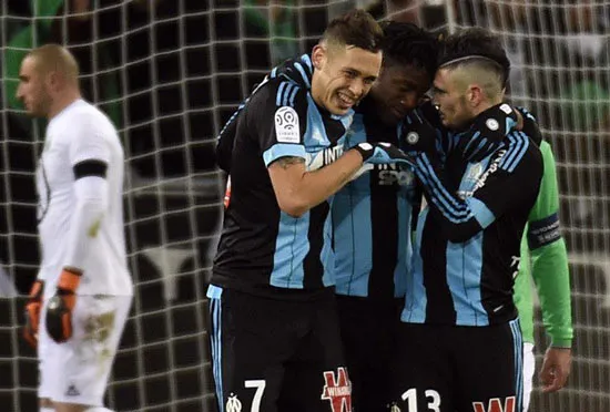 Các cầu thủ Marseille ăn mừng chiến thắng trên sân St Etienne.