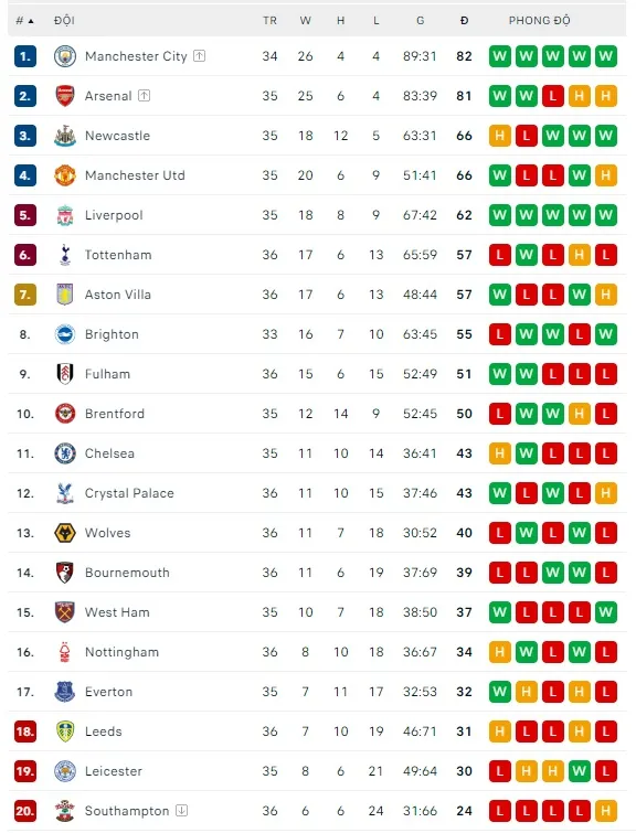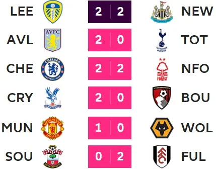 Trong ngày Newcastle đánh rơi chiến thắng trong trận hòa 2-2 với 10 cầu thủ Leeds United, Man United đã bắt kịp họ ở điểm số 66 dù kém xa hiệu số thắng bại. Man United vẫn đứng thứ 4 sau 35 trận nhưng đã có được khoảng cách 4 điểm so với đối thủ bám sau lưng là Liverpool.
