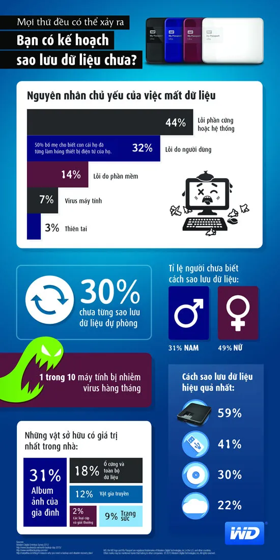 Khảo sát của Western Digital năm 2012 cho thấy 44% việc mất dữ liệu do lỗi phần cứng hoặc hệ thống, 32% do bất cẩn của người dùng, 14% do lỗi phần mềm và khoảng 7% từ virus máy tính. Do vậy, việc lưu trữ dữ liệu vô cùng quan trọng. Tuy nhiên, có tới 30% người dùng chưa từng sao lưu dữ liệu dự phòng; 31% nam giới chưa biết cách sao lưu dữ liệu, trong khi tỷ lệ này ở nữ giới là 49%. Một khảo sát của Western Digital trên người dùng cũng chỉ ra, có đến 59% người dùng sử dụng ổ cứng để lưu trữ, trong khi chỉ có 41% người dùng sử dụng USB. Người dùng cần căn cứ vào đặc điểm và yêu cầu công việc riêng của mình để chọn hình thức thích hợp nhất. Ví dụ, USB phù hợp cho việc lưu và trao đổi file dung lượng thấp tại chỗ, trong khi ổ cứng phù hợp lưu trữ lượng dữ liệu lớn, cần độ bảo mật cao, tốc độ sao lưu lớn, vừa an toàn và thuận tiện trong sử dụng khi cần di chuyển nhiều.