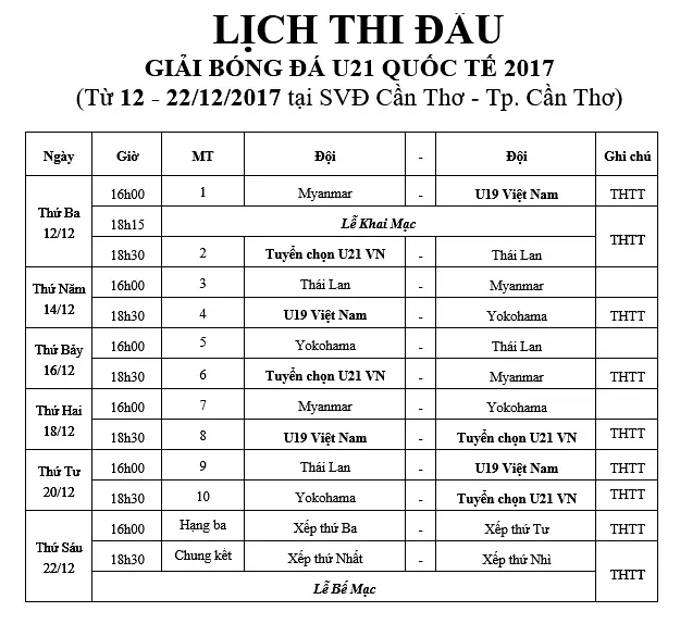 Bên cạnh đó, BTC giải đã công bố lịch thi đấu của giải U21 quốc tế 2017, sẽ diễn ra tại Cần Thơ từ ngày 12-11 tới, lịch thi đấu cụ thể như sau: