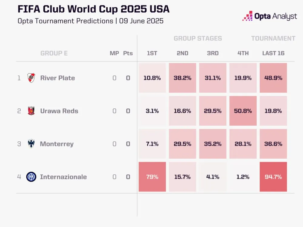 Dù cơ hội thoát khỏi Bảng E của River gần như ngang ngửa (48,9%), đội bóng Argentina chỉ có 10,8% khả năng đứng đầu bảng. Tuy nhiên, thắng hai trận đầu tiên là khả thi, khi River xếp trên Monterrey 41 bậc và hơn Urawa Reds gần 200 bậc trong Bảng xếp hạng Sức mạnh Opta Power.