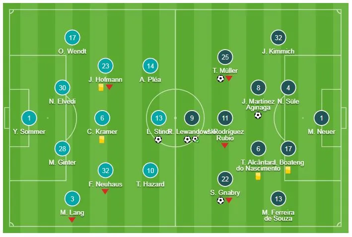 Bayern: Martinez 2'; Mueller 11'; Lewandowski 47', 90'; Gnabry 75'
