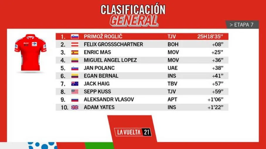 Primoz Roglic cán đích ở vị trí thứ 16 kém Michael Storer 3 phút 33 giây nhưng nhờ “ôm chặt” những đối thủ cạnh tranh trực tiếp trên bảng tổng sắp nên vẫn bảo vệ được áo đỏ với tổng thành tích 25 giờ 18 phút 35 giây. Đáng chú ý, với việc về đích thứ 7 sau Michael Storer 1 phút 32 giây, tay đua Felix Grossschartner (Bora-Hansgrohe) đã vươn lên vị trí thứ hai bảng tổng sắp cá nhân, kém áo đỏ Primoz Roglic chỉ 8 giây.
