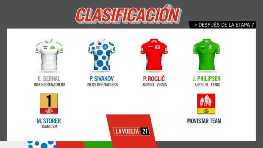 Với màn trình diễn ấn tượng trên các ngọn đèo (xếp nhất đèo thứ 5, xếp nhì trên ngọn đèo thứ 1 và thứ 4, xếp ba ngọn đèo thứ 6), tay đua người Nga Pavel Sivakov (Ineos Grenadiers) đã vươn lên giành áo trắng chấm bi xanh giành cho vua leo núi 16 điểm. Trong khi đó, với 131 điểm, Jasper Philipsen (Alpecin–Fenix) vẫn giữ áo xanh lá cây (tính điểm nước rút) với khoảng cách mong manh chỉ 1 điểm với Fabio Jakobsen (Deceuninck–Quick-Step).