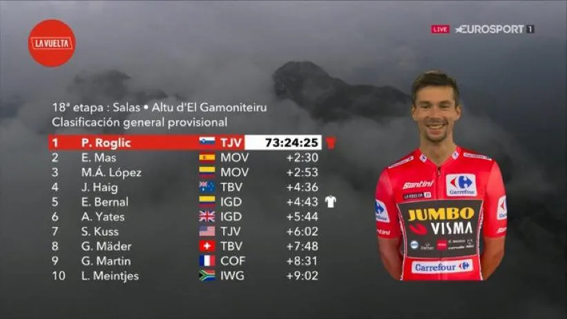 Primoz Roglic cũng có niềm vui không kém khi vẫn giữ được áo đỏ tổng sắp với thành tích 73 giờ 24 phút 25 giây, gia tăng khoảng cách với người thứ hai Enric Mas (Movistar) lên 2 phút 30 giây.
