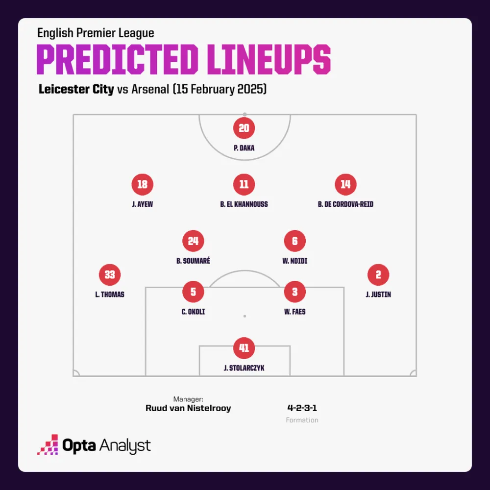 Nhiệm vụ dường như không thể lớn hơn đối với Leicester. Kể từ khi Ruud van Nistelrooy được bổ nhiệm vào tháng 12, chỉ có Southampton thua nhiều trận hơn (9) và kiếm được ít điểm hơn (4) so với đội bóng đang gặp khó khăn này (2 thắng, 1 hòa, 8 thua – 7 điểm). Hàng phòng ngự lỏng lẻo là một vấn đề lớn đối với Leicester, đội bóng đã không thể giữ sạch lưới trong bất kỳ trận đấu nào ở 17 trận gần nhất tại giải vô địch, kể từ chiến thắng 1-0 trước Bournemouth tại King Power vào tháng 10. Thực tế, chỉ có Southampton (54 bàn) để lọt lưới nhiều hơn Leicester (53 bàn) tại Premier League mùa này.