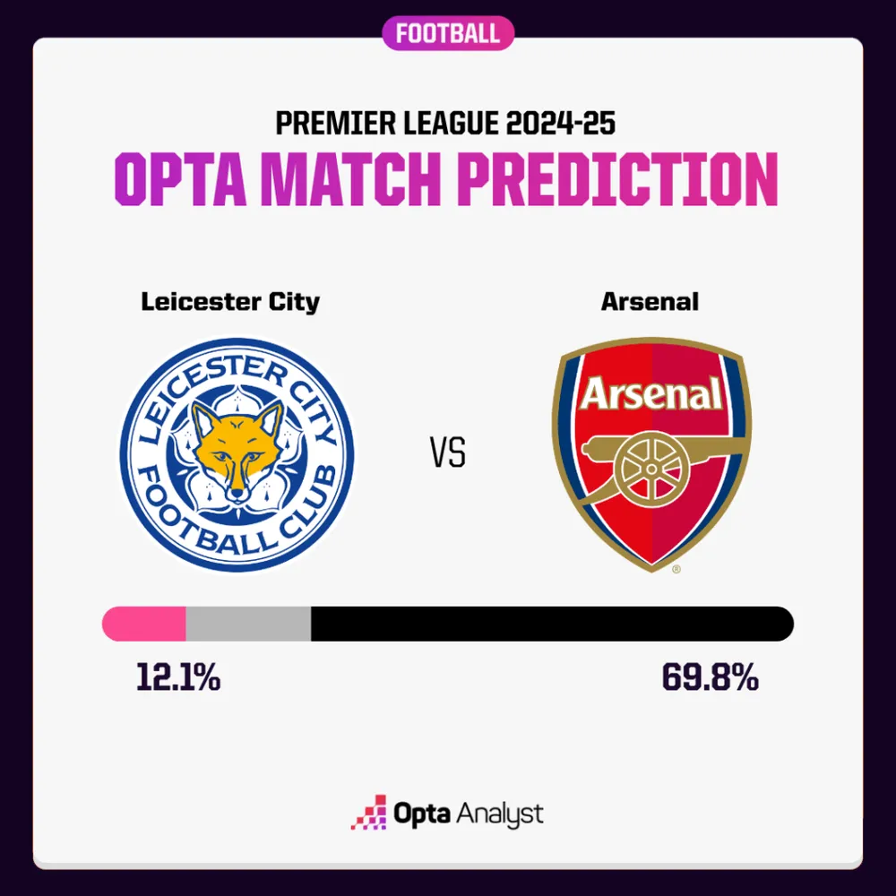 Arsenal được cỗ máy dự đoán Opta đánh giá là ứng cử viên sáng giá để giành chiến thắng trước Leicester, với xác suất thắng lên tới 69,8% . Hy vọng của Leicester trong việc giành 3 điểm quan trọng để tránh xuống hạng chỉ là 12,1%, trong khi xác suất hòa là 18,1%.