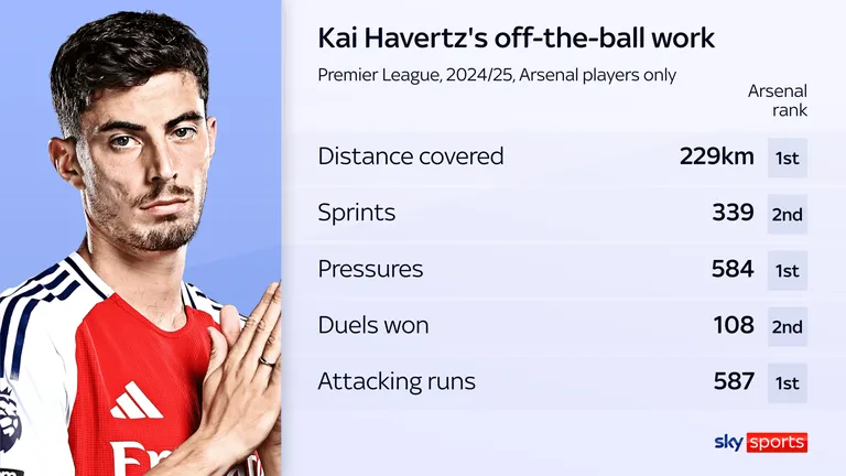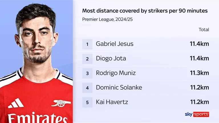 Trong số các cầu thủ không phải thủ môn của Arsenal mùa này, chỉ có William Saliba và Gabriel có nhiều phút thi đấu hơn Havertz. Havertz đã có 34 lần ra sân trên mọi đấu trường, sau khi đã chơi 51 trận vào mùa trước. Thêm vào đó, vai trò của tiền đạo số 9 dưới thời Arteta đòi hỏi thể lực đặc biệt cao. Dữ liệu theo dõi của Premier League mùa này cho thấy điều đó. Gabriel Jesus và Havertz lần lượt xếp thứ nhất và thứ năm trong số các tiền đạo về quãng đường di chuyển trung bình mỗi 90 phút. Đáng chú ý, Dominic Solanke, người cũng có khối lượng chạy tương tự cho đối thủ cùng thành phố Tottenham, cũng vừa phải nghỉ thi đấu vì chấn thương gần đây.