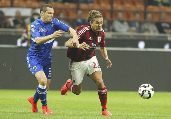 Alessio Cerci (phải, AC Milan) vượt qua Djamel Mesbah (Sampdoria).