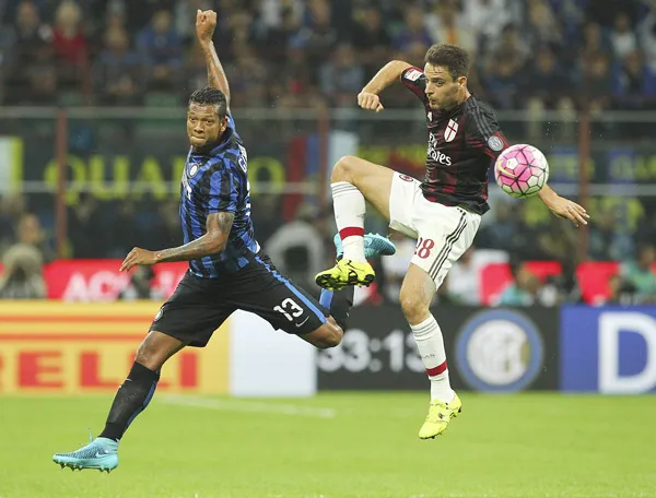 Giacomo Bonaventura (phải, AC Milan) kiểm soát bóng trước Fredy Guarin (Inter).