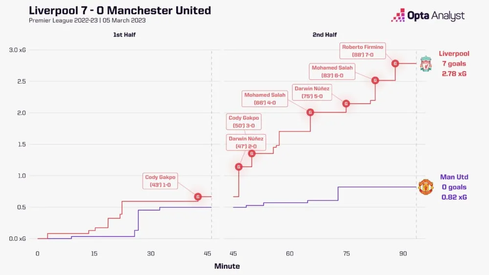Điều đó khiến Salah trở thành cầu thủ duy nhất trong lịch sử Premier League ghi được 3+ bàn thắng trên sân khách trước Man Utd trong hai lần. Bàn thắng gần đây nhất đã đưa anh lên con số bảy bàn thắng tại Premier League tại Old Trafford, kỷ lục đối với một cầu thủ đối phương – ban đầu anh đã tự phá kỷ lục của mình với quả phạt đền muộn mà anh thực hiện trong trận hòa 2-2 vào tháng 4 năm ngoái.