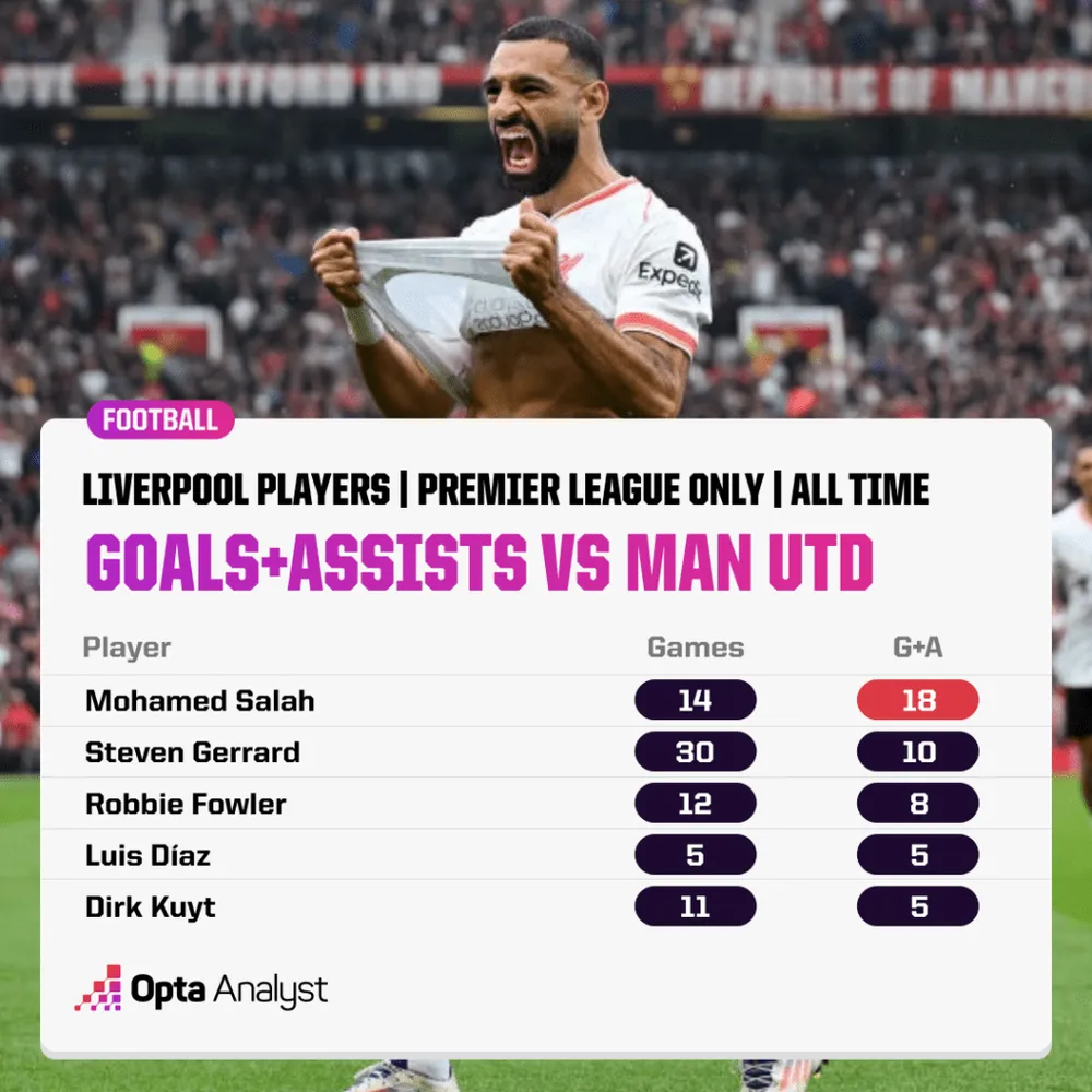 Cầu thủ duy nhất khác của Liverpool ghi được hơn ba bàn thắng tại Old Trafford trong giải đấu là Gerrard (5), trong khi Salah đã ghi bàn ở đó ít nhất ba lần nhiều hơn bất kỳ ai khác (không chỉ những cầu thủ cũ/hiện tại của Liverpool).