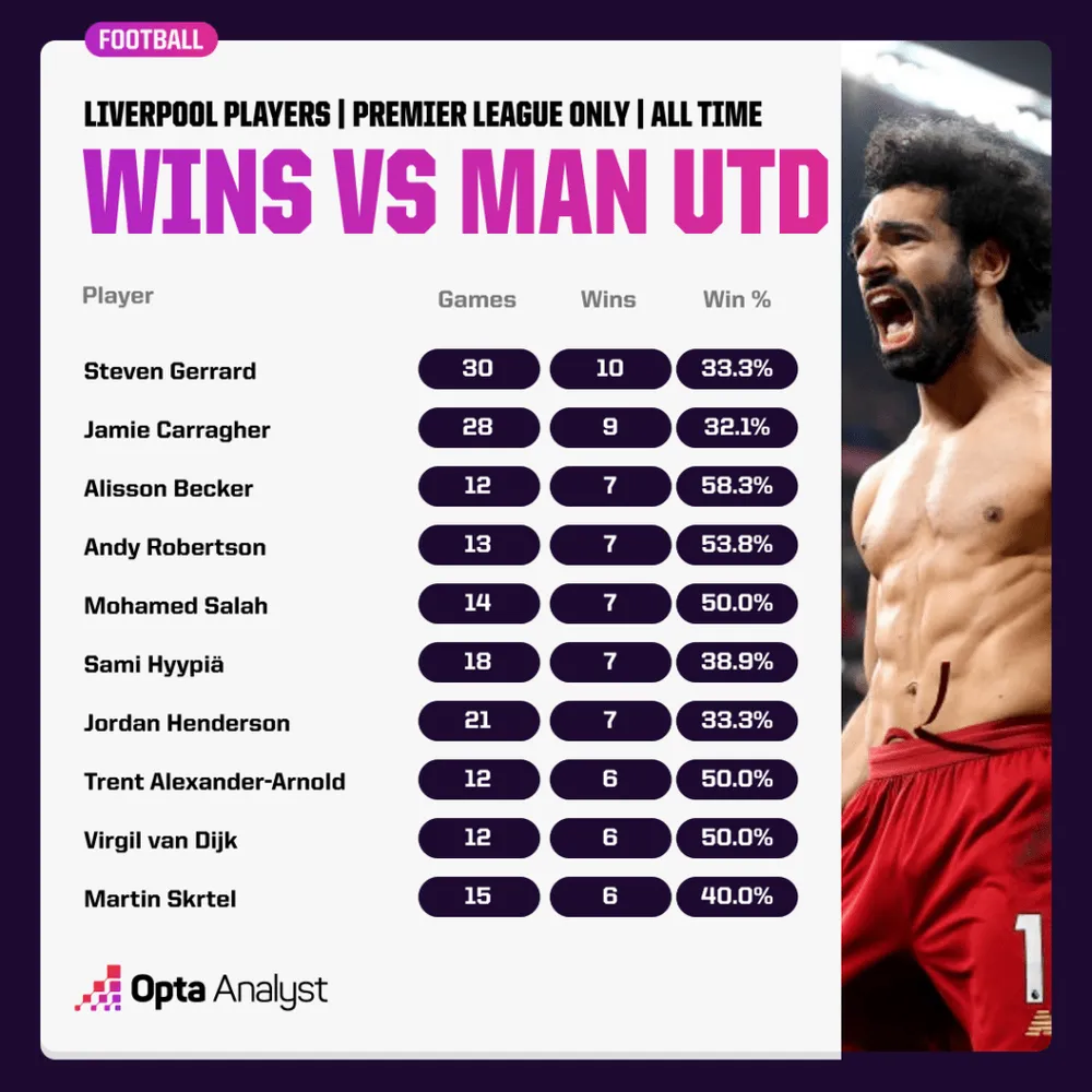 Chỉ có hai cầu thủ Liverpool có thể vượt qua thành tích bảy trận thắng của Salah trước United tại Premier League, trong đó Gerrard (10) và Jamie Carragher (9) dẫn đầu không có gì đáng ngạc nhiên - nhưng điều đáng chú ý là tỷ lệ chiến thắng tương ứng của họ trong trận đấu này là 33,3% và 32,1% thấp hơn đáng kể.