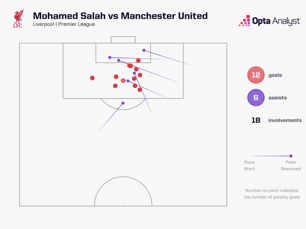Thành tích của Salah trước Man United là chỉ có bốn cầu thủ trong lịch sử Premier League có nhiều bàn thắng hơn trước một đối thủ duy nhất cho cùng một đội: Harry Kane (22 bàn cho Tottenham trước Leicester), Wayne Rooney (21 bàn cho Man Utd trước Newcastle), Frank Lampard (20 bàn cho Chelsea trước Bolton) và Thierry Henry (19 bàn cho Arsenal trước Middlesbrough). Ngay cả khi xét đến tình hình khó khăn hiện tại của Man United, tất cả chúng ta đều có thể đồng ý rằng thành tích của Salah đến từ một đối thủ có trình độ cao hơn so với tổng số bàn thắng của những người khác.
