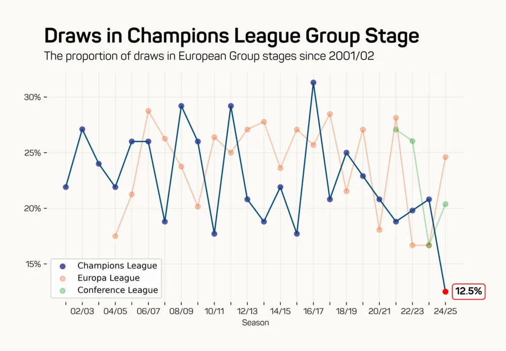 Một xu hướng khác cho thấy sự chênh lệch trong các trận đấu vòng bảng là số lượng trận hòa ít ỏi. Chỉ có 18 trận hòa trong 144 trận, tỷ lệ thấp nhất trong bất kỳ vòng bảng nào của Cúp châu Âu kể từ năm 2000-01.