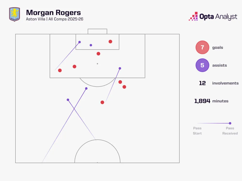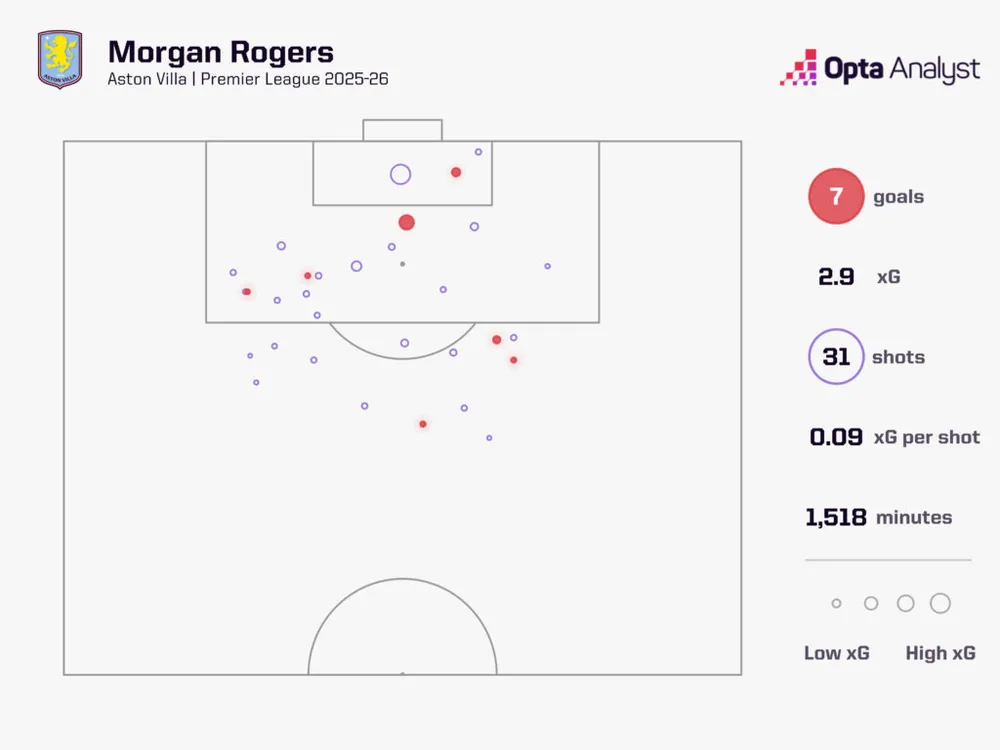 Nhưng điều khiến giới chuyên môn kinh ngạc không chỉ là số lượng, mà là chất lượng của các bàn thắng: Rogers đã ghi 7 bàn thắng từ chỉ số bàn thắng kỳ vọng (xG) chỉ là 2.86. Mức vượt ngưỡng +4.14 là con số cao nhất giải đấu, chứng minh anh đang thực hiện những pha dứt điểm ở cấp độ không tưởng. Không cầu thủ nào ghi nhiều bàn thắng từ ngoài vòng cấm hơn Rogers (3 bàn) mùa này. Những cú nã đại bác vào lưới Spurs, West Ham hay Man Utd là minh chứng cho một sự tự tin đã chạm trần.