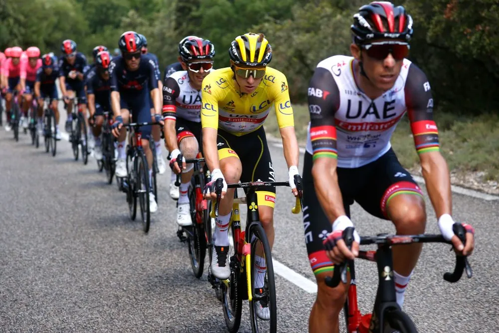 Ở phía sau, UAE Emirates dằn tốc độ nhóm các tay đua mạnh để bảo vệ áo vàng Tadej Pogacar. Vì thế, khi còn 50km, khoảng cách giữa nhóm đầu với áo vàng Tadej Pogacar đã là 12 phút 38 giây. Khoảng cách này không đủ uy hiếp áo vàng Tadej Pogacar nên UAE Emirates vẫn đủng đỉnh. Họ muốn Tadej Pogacar có một chặng đua nhẹ nhàng, lấy lại thể thực sau những chặng đèo vất vả để củng cố áo vàng.