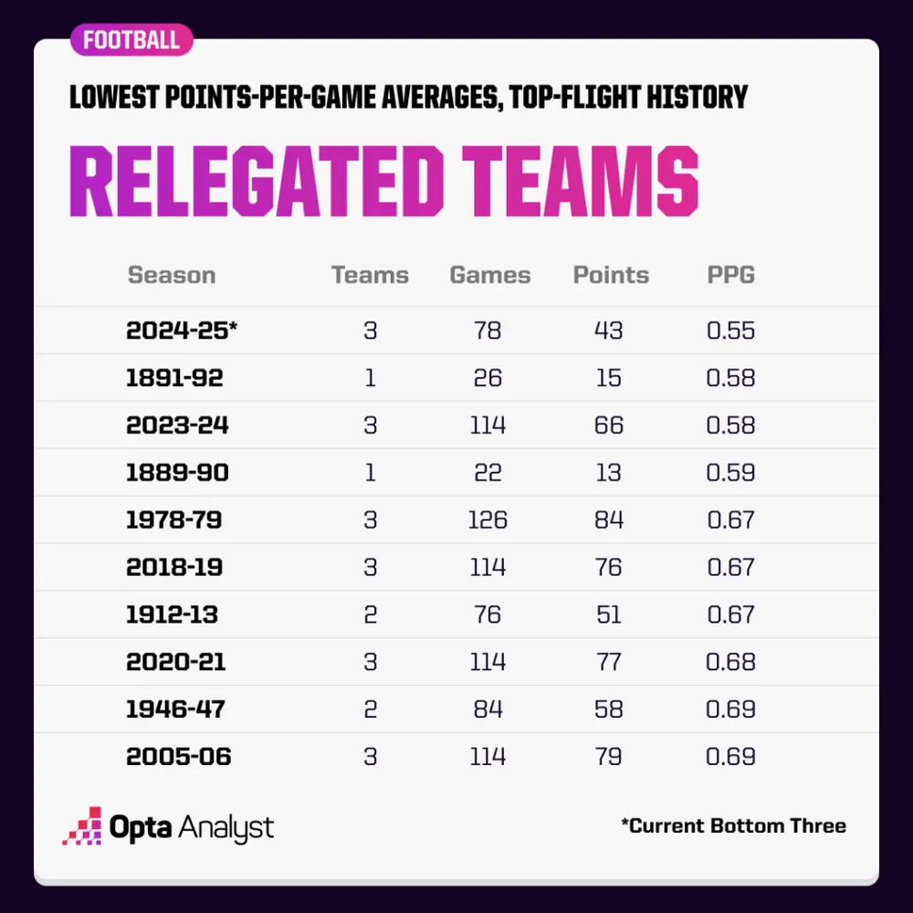 Mùa giải này không có nhiều kịch tính trong cuộc chiến trụ hạng, và có vẻ như sẽ không có cuộc chiến nào cả. Các đội mới thăng hạng Ipswich, Leicester và Southampton từng được dự đoán sẽ xuống hạng ngay từ đầu, và siêu máy tính Opta giờ đây coi họ gần như chắc chắn. Hai đội này hiện đang có trung bình 0,55 điểm mỗi trận trong mùa giải 2024-25, thấp hơn bất kỳ ba đội xuống hạng nào trong lịch sử giải đấu hàng đầu. Đúng vậy, nếu nhìn lại từ buổi bình minh của bóng đá Anh – không chỉ trong kỷ nguyên Premier League – ba đội cuối bảng đang trên đà có thành tích tồi tệ nhất lịch sử.