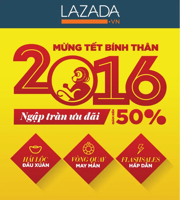 Trong dịp mua sắm mừng năm mới và Tết Âm lịch 2016, Trang Mua sắm trực tuyến Lazada.vn mang đến cho người tiêu dùng chương trình khuyến mãi “Mừng Tết Bính Thân, ngập tràn ưu đãi” diễn ra từ ngày 26-1 và dự kiến kết thúc vào ngày 29-1 với việc giảm giá 50% hầu hết sản phẩm, cùng chương trình “Giờ vàng giá sốc” diễn ra mỗi ngày với nhiều sản phẩm giảm giá đặc biệt thuộc nhiều thương hiệu hàng đầu như Clinique, Go Pro, Nike, Canon,… cùng hàng loạt sản phẩm đồng giá phát tài may mắn.