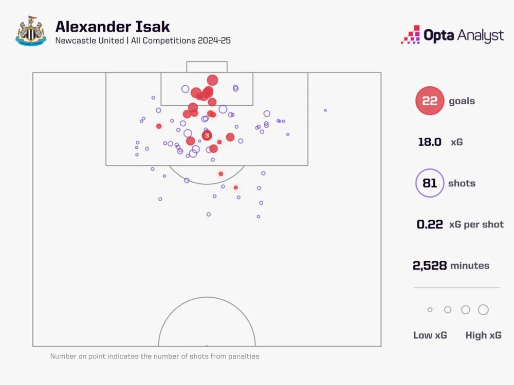Khả năng ghi bàn của Isak cũng có thể đóng vai trò quyết định vào Chủ nhật, khi các trận chung kết thường được định đoạt bởi những khoảnh khắc nhỏ. Cả ba bàn thắng của anh vào lưới Liverpool đều giúp Newcastle dẫn 1-0 (2 lần) hoặc gỡ hòa (1 lần). Isak không thi đấu trong trận gặp Liverpool tại Anfield tháng trước, điều này ảnh hưởng rõ rệt đến Newcastle, khi họ chỉ tung ra ba cú sút trong cả trận và không có nổi một pha dứt điểm trúng đích – lần thứ hai họ rơi vào tình cảnh này tại Premier League mùa giải năm nay (lần còn lại là trước Crystal Palace vào tháng 11). Trước mùa này, họ chỉ rơi vào tình trạng đó trong một trận đấu tại giải Ngoại hạng qua các mùa 2020-21, 2021-22, 2022-23 và 2023-24 cộng lại.