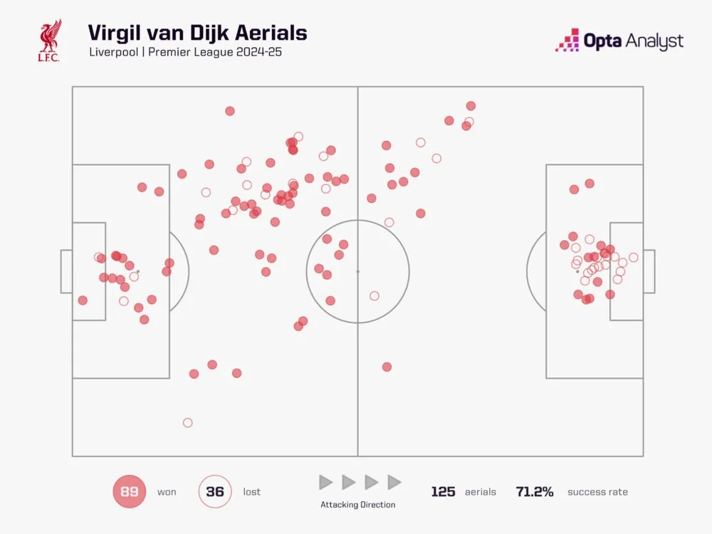 Trong số các hậu vệ tại Premier League mùa này, chỉ có ba người thắng nhiều pha tranh chấp trên không hơn Van Dijk (89/125) và chỉ hai người có tỷ lệ thắng tranh chấp tổng thể cao hơn mức 69,4% của anh (tối thiểu 300 phút thi đấu).