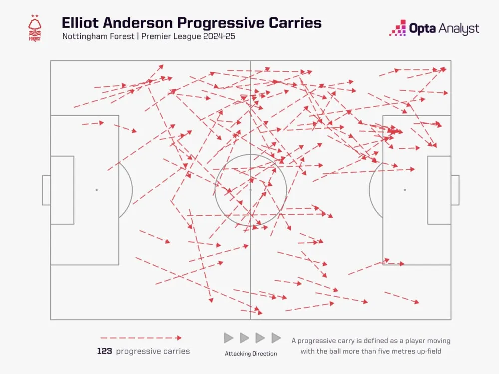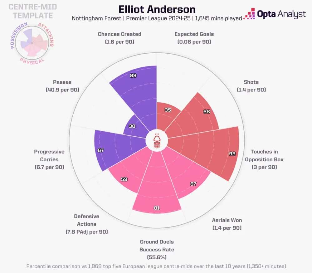 Nuno nhấn mạnh tầm quan trọng của sự cân bằng đối với đội bóng Forest của ông, và Anderson thể hiện điều đó một cách hoàn hảo với khả năng toàn diện xuất sắc của mình, điều này cũng khiến anh ấy trở thành một sự phù hợp tuyệt vời trong một đội bóng tìm cách tận dụng các pha phản công nhanh và gây tổn thương cho đối thủ trong các tình huống chuyển tiếp. Anh ấy có thể giành lại bóng, có thể tự mình cầm bóng tiến lên với mục đích rõ ràng, và cũng có thể thực hiện những đường chuyền quyết định, như được chứng minh bởi năm pha kiến tạo của anh ấy, chỉ có sáu tiền vệ khác vượt qua con số này trong mùa giải này. Có lẽ nhiều bàn thắng hơn cũng sẽ đến trong tương lai?