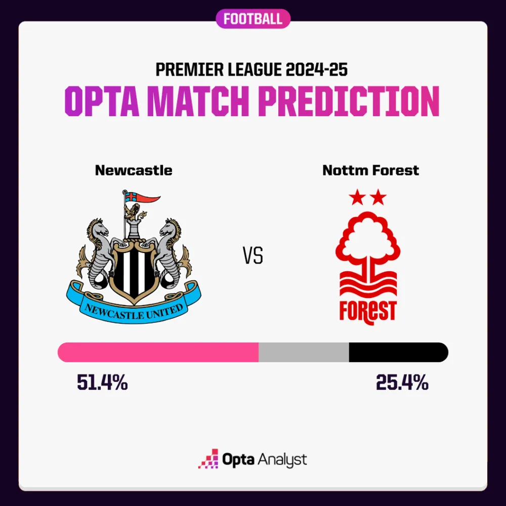 Mặc dù Forest đang có phong độ cao nhưng Newcastle được đánh giá là đội bóng được ưu ái hơn với xác suất chiến thắng là 51,4%. Tuy nhiên, Forest vẫn có cơ hội không nhỏ với tỷ lệ chiến thắng là 25,4%. Tỷ lệ hòa là 23,3%